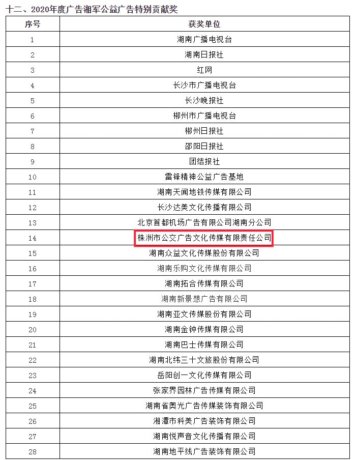 由湖南省廣告協(xié)會主辦的"2020年度廣告湘軍總評榜",經(jīng)行業(yè)指導(dǎo)單位、高校專家學(xué)者、行業(yè)代表和協(xié)會秘書處組成評審委員會,本著公平公開公正原則,經(jīng)認真評選,揭曉2020年度廣告湘軍總評榜獲獎名單,株洲公交廣告再度榮獲"2020年度廣告湘軍公益廣告特別貢獻獎"殊榮。